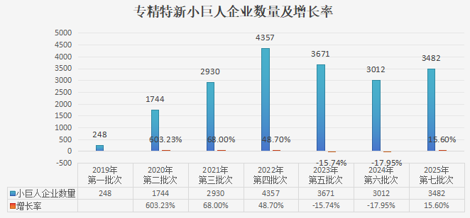 自從2019年啟動(dòng)第一批認(rèn)定以來(lái),工信部已經(jīng)陸續(xù)培育了七批國(guó)家級(jí)專(zhuān)精特新“小巨人”企業(yè)。2025年新認(rèn)定的數(shù)量達(dá)到3482家,比2024年的3012家多了470家,增長(zhǎng)率約15.60%。