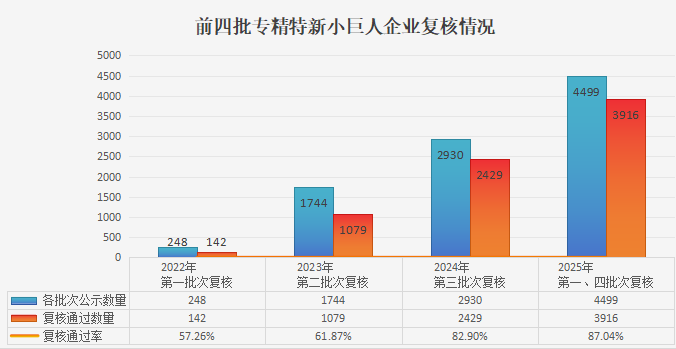 近幾年專(zhuān)精特新“小巨人”的復(fù)審?fù)ㄟ^(guò)率一直在上升,2025年通過(guò)復(fù)審的企業(yè)有3916家(包括第一批和第四批復(fù)審),復(fù)核通過(guò)率提升到87.04%,比2024年高了4.14個(gè)百分點(diǎn)。