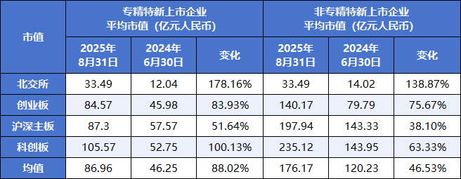 和2024年數(shù)據(jù)對(duì)比,今年專(zhuān)精特新和非專(zhuān)精特新企業(yè)市值都顯著上升,其中專(zhuān)精特新企業(yè)平均市值上升88.02%,非專(zhuān)精特新企業(yè)上升46.53%。這反映了市場(chǎng)信心回暖,而專(zhuān)精特新企業(yè)因在細(xì)分領(lǐng)域有核心技術(shù)、高研發(fā)投入和強(qiáng)創(chuàng)新能力,成長(zhǎng)潛力和盈利彈性更高,更受投資者青睞,也說(shuō)明資本市場(chǎng)正加速向“高質(zhì)量發(fā)展”轉(zhuǎn)型。
