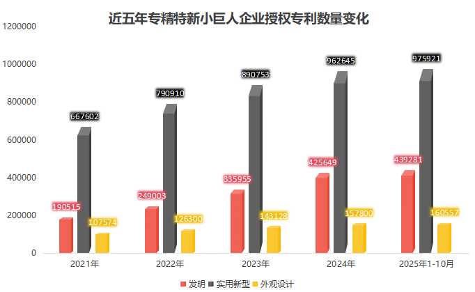 截至2025年10月31日,專(zhuān)精特新小巨人企業(yè)共有1575759件授權(quán)專(zhuān)利,其中發(fā)明專(zhuān)利439281件,實(shí)用新型專(zhuān)利975921件,外觀設(shè)計(jì)專(zhuān)利160557件。發(fā)明專(zhuān)利授權(quán)量占全國(guó)專(zhuān)精特新小巨人授權(quán)專(zhuān)利總量的27.88%,占全國(guó)授權(quán)發(fā)明專(zhuān)利總量的5.72%,這充分體現(xiàn)了“小巨人”的科技含量。