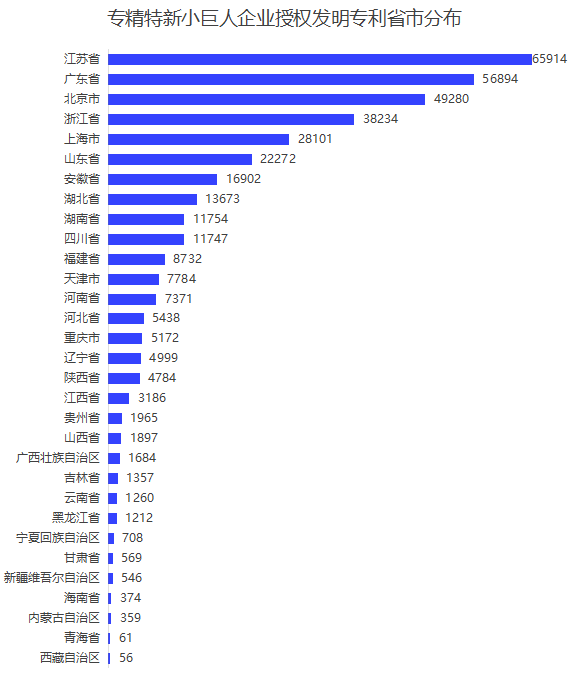 從省份分布上來(lái)看,專(zhuān)精特新小巨人企業(yè)授權(quán)發(fā)明專(zhuān)利主要分布在江蘇省、廣東省和北京市。