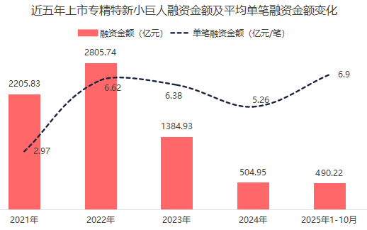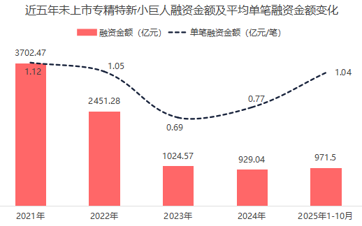 近五年(2021年1月1日-2025年10月31日),專(zhuān)精特新小巨人企業(yè)共發(fā)生融資事件10806筆,融資金額16470.53億元,平均單筆融資額1.52億元。其中已上市企業(yè)發(fā)生融資事件1550筆,融資金額7391.67億元,平均單筆4.77億元;未上市企業(yè)發(fā)生融資事件9256筆,融資金額9078.86億元,平均單筆0.98億元。